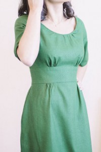 Version 1 is perfect for cooler weather; the 3/4-sleeved raglan- style dress has a flat front skirt which sports a kick pleat at the back hem. Small gathers create gentle curves around an inset waist yoke. The neckline and sleeves are finished with bias tape for a clean look without the need for fussy facing pieces.