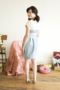 A flattering and curvy dress. Includes a bodice fitted with darts, along with a contrasting top yoke, sleeves, and narrow midriff band. Short sleeves are gently scalloped along the sleeve hem, echoing the shape of the bodice. Skirt has large pleats, with pockets hidden in the front pleats. Closes with an invisible side zip.
